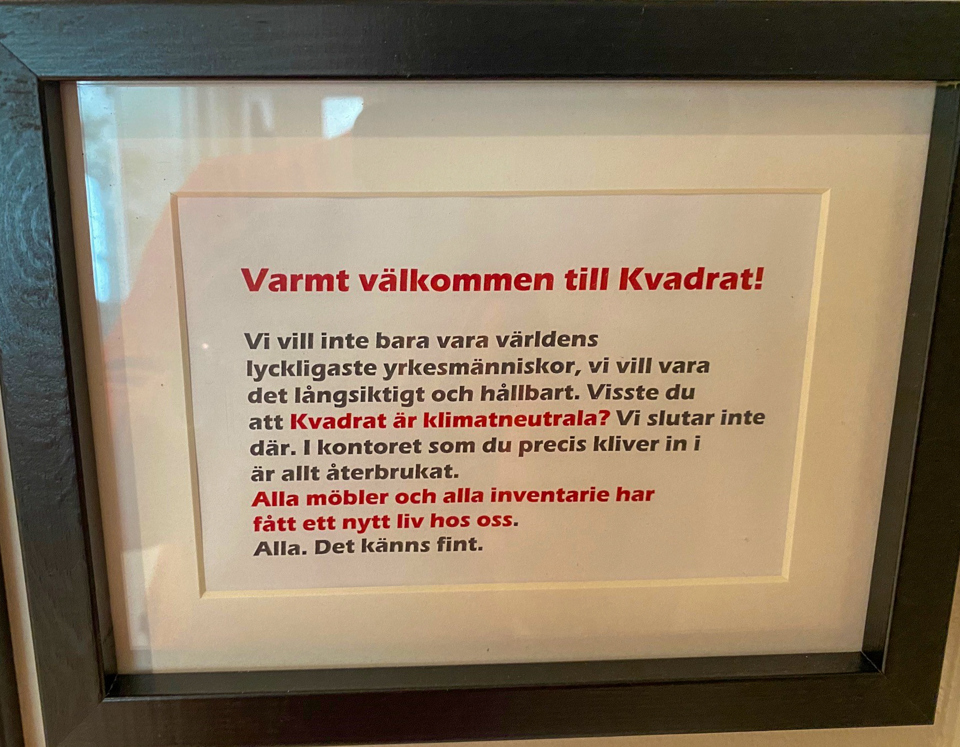 Kvadrat Växjö gick från en till 16 anslutna konsulter på två år och växte ur sitt kontor i World Trade Center. När Jan Cserpes, VD för bolaget, började titta på ny lokal slog det honom att rätt många företag just nu avvecklar sina stora lokaler. Detta eftersom många vill jobba mer hemma efter pandemin. Det satte igång tankarna på återbrukade möbler. Vi har pratat med Janne och den inredningsdesigner som hjälpte honom inreda det nya kontoret, Bijou Burns.