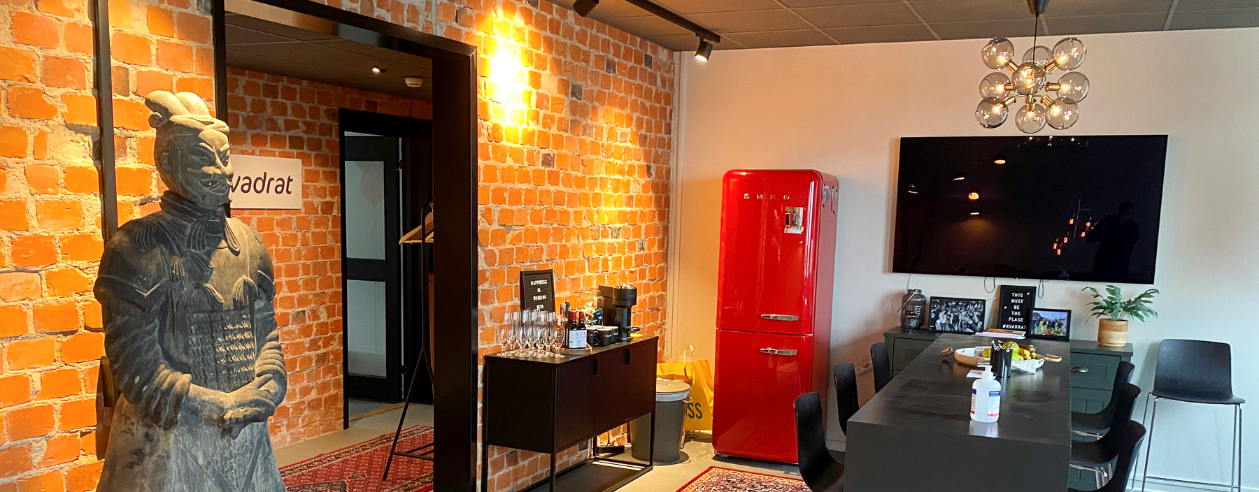 – Vi tittade på återbrukssajter och även på ställen som Facebook Marketplace och auktionssajter. Framför allt var det Bijou som jobbade med det. Jag tog hennes lista på möbler och reste regionen runt och budade och körde hem möbler. Alla möbler, alla skrivbord, alla stolar, konferensbord, designmöbler, soffor, orientaliska mattor, tavlor och kylskåp är återbrukat. Väldigt mycket av det är designmöbler. Samtidigt som vi inte slösat på våra begränsade resurser i världen har vi sparat en jäkla massa pengar. Hela kontoret, nästan hundratio kvadrat, är bara återbrukade möbler. Det enda som är nytt är ”ljud och bild”. Vi valde att köpa en ny Sonos-anläggning och en stor bildskärm för väggmontage, det har bland annat med garanti att göra.